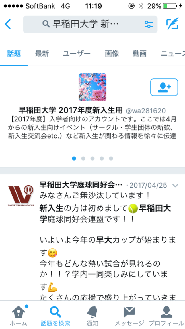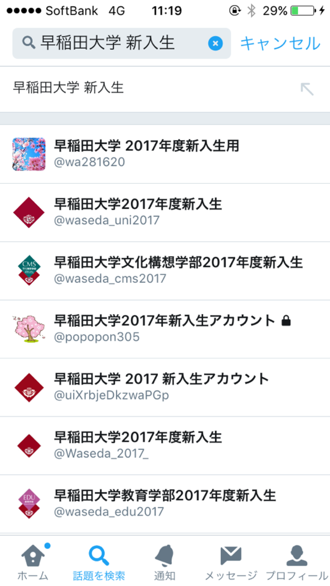 のように、「自分が入学する大学名」と「新入生」または「入学年度」のどちらかで検索すると新入生専用のアカウントが見つかります。